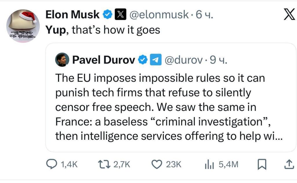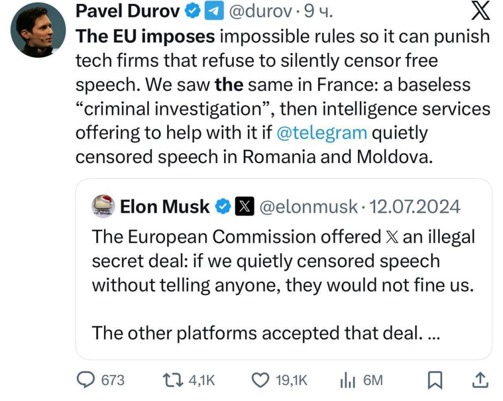 На Конфликтот се приклучи и основачот на палтформата „Телеграм“, Павел Дуров. Тој го поддржа Маск и изјави дека ЕУ го бара невозможното за да изврши притисок врз компаниите кои не сакаат да ја ограничат слободата на говорот.