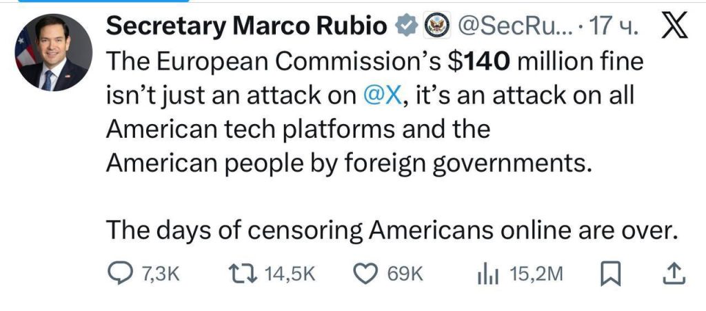 Владата на САД се придружи во јавната расправија околу цензурата, притисокот врз платформите и мешањето во политиката. Државниот секретар Марко Рубио ги нарече постапките на Европската комисија напад врз Америка и „удар врз сите американски технолошки платформи и американскиот народ од страна на странски влади“.