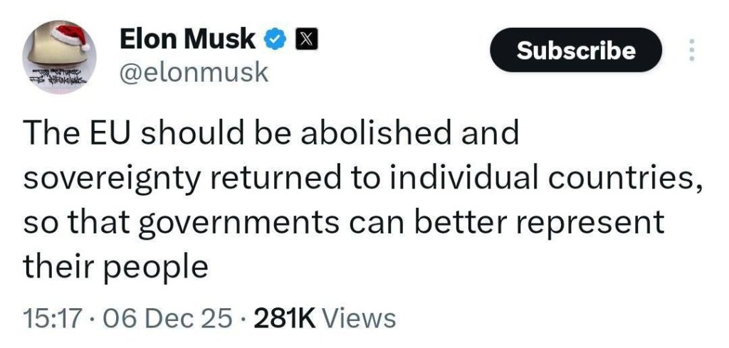 ЕУ треба да се укине, а нејзините земји треба да го вратат својот суверенитет за подобро да ги претставуваат интересите на своите народи“, порача Маск.