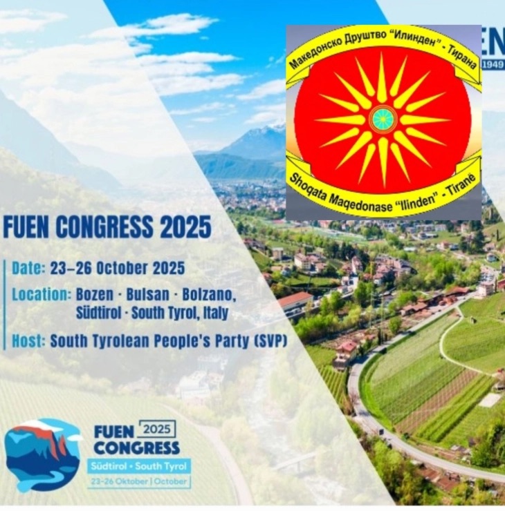 Македонското друштво “Илинден”-Тирана, ќе учествува на Конгресот на Федералната унија на европски националности (ФУЕН) ќе се одржи од 23 до 26 октомври во Болзано во Јужен Тирол, Италија домаќин ќе биде Јужнотиролската народна партија членка на Федералната унија на европски националности (ФУЕН).