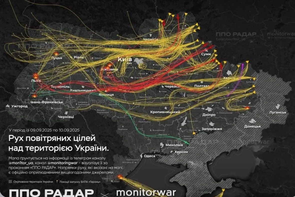 Украинските медиуми објавија мапа со деталите од синоќешните руски напади врз Украина, при што главни цели беа Донбас и регионите Ивано-Франкивск, Лвов, Луцк, Одеса, Виница и Житомир. Дел од беспилотните летала го напуштија украинскиот воздушен простор и влегоа во Полска – според украинските извори, дури 14 руски дронови ја нарушиле полската воздушна граница.