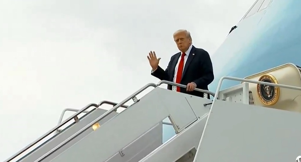 Авионот „Ер Форс Уан“ слета на лондонскиот аеродром Станстед, каде што Трамп беше пречекан од британската министерка за надворешни работи Ивет Купер.