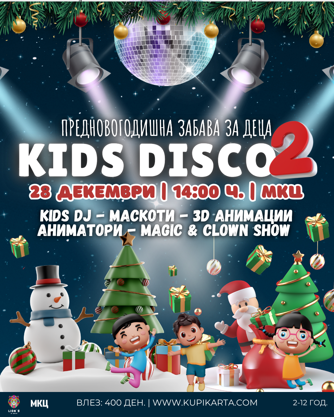 „Kids Disco“ е внимателно осмислено интерактивно шоу наменето за деца од 2 до 12 години, кое комбинира музика, танц, анимација и визуелна магија. Програмата вклучува Kids DJ, маскоти, 3D анимации, професионални аниматори, како и Magic & Clown Show, создавајќи безбедна, весела и незаборавна атмосфера за најмладата публика.
