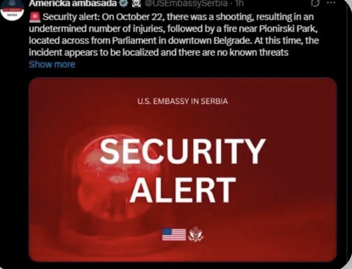 Американската амбасада во Белград издаде безбедносно предупредување поради инцидент што се случи денеска пред српскиот парламент. Како што објави Амбасадата на мрежата X, дошло до пукање во кое биле повредени непознат број луѓе, а потоа избувнал пожар во Пионирскиот парк, во близина на улицата пред парламентот.