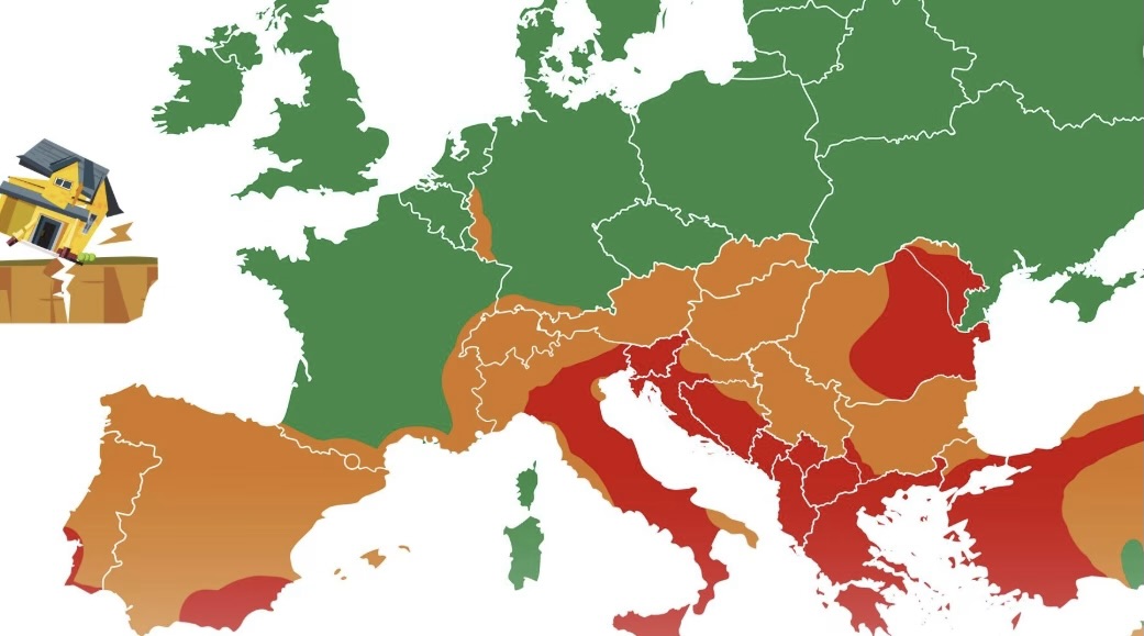 Од друга страна, Ирска, Велика Британија, Скандинавија, балтичките земји и Полска се прикажани како речиси целосно безбедни региони. Шпанија, Португалија, Франција, Австрија и Унгарија влегуваат во портокаловата зона, додека Италија е претставена речиси целосно во црвено, што ја издвојува како една од најподложните земји на тектонски активности.