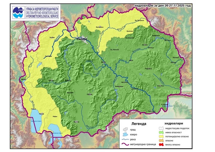 Според хидроалармот, речиси целата територија е во зона со потенцијално опасни услови. Најизложени се централниот и источниот дел на државата, додека Скопје се смета за стабилно, но неговата околина, како Куманово, Крива Паланка, Кочани, Штип, Берово и Делчево, се наоѓаат во зелена предупредувачка зона, што значи дека состојбата може брзо да се влоши доколку врнежите станат обилни.