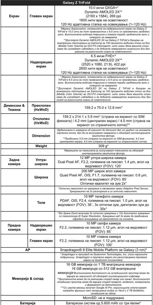 ¹Мерено дијагонално, големината на надворешниот екран на Galaxy Z TriFold е 10,0 инчи во полн правоаголник и 9,9 инчи со пресметани заоблени агли. Вистинската видлива површина е помала поради заоблените агли и отворот за камерата.