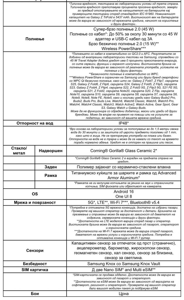 ⁵Типичната вредност е тестирана во лабораториски услови од трета страна. Типичната вредност е проценета просечна вредност, земајќи го предвид отстапувањето во капацитетот на батеријата кај примероците тестирани според стандардот IEC 61960. Номиналниот капацитет на Galaxy Z TriFold е 5437 mAh. Вистинскиот век на батеријата може да варира во зависност од мрежната средина, начинот на користење и други фактори.