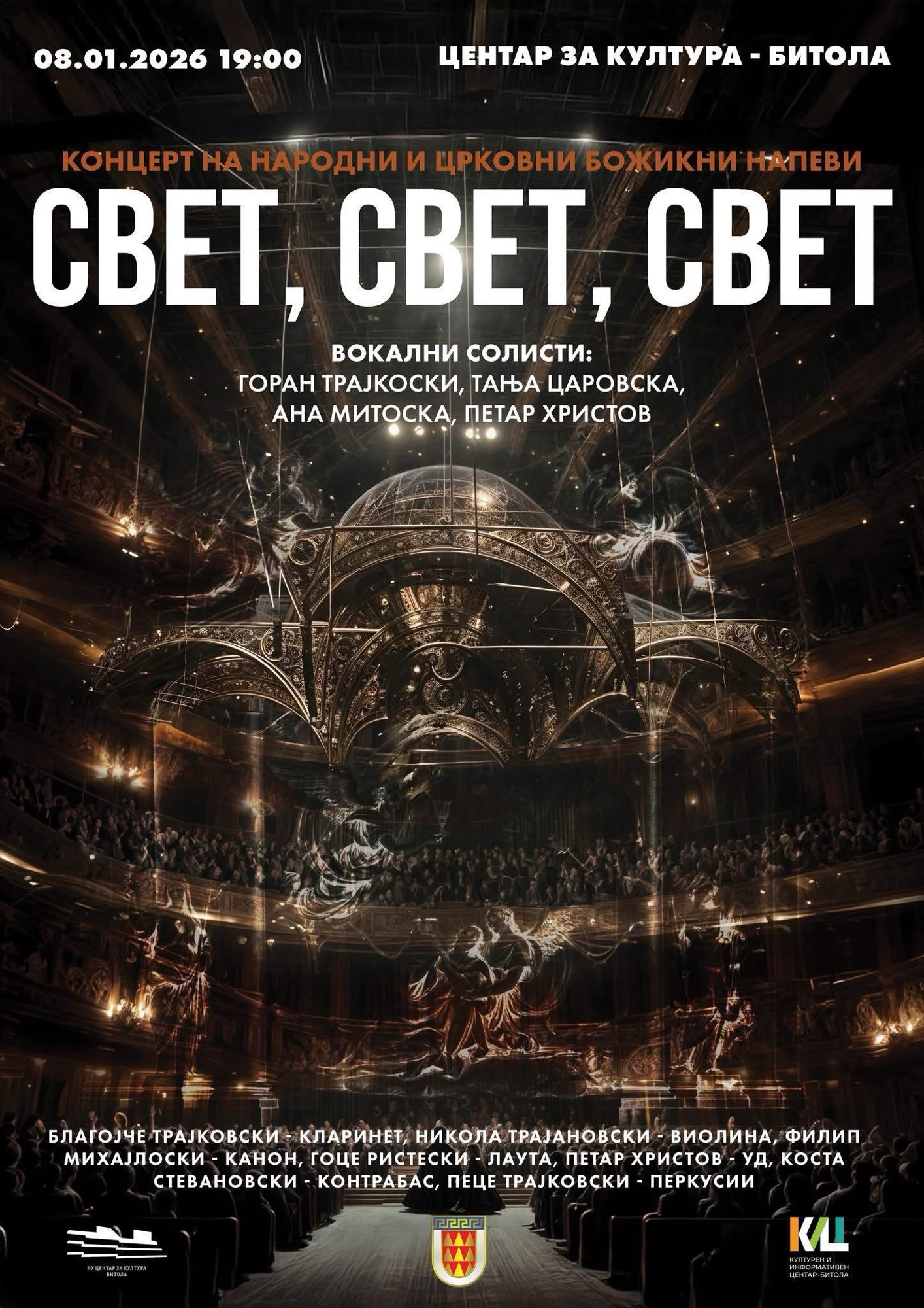 Општина Битола, во соработка со Центарот за култура и Културниот и информативен центар, организира голем Божиќен концерт на народни и црковни напеви под наслов „Свет, Свет, Свет“, со кој ќе се одбележи раѓањето Христово.