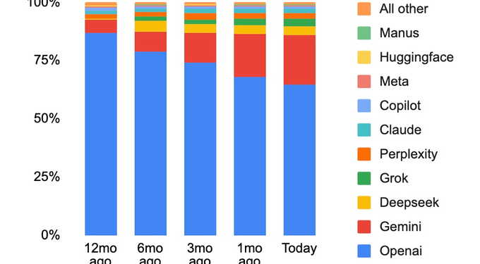 Најновите анализи укажуваат на значајни промени на пазарот на AI чатботови, каде што досегашната доминација на ChatGPT постепено слабее, а Google Gemini бележи забрзан раст. Според податоците на аналитичката компанија SimilarWeb, ChatGPT моментално учествува со околу 64,5% од вкупниот сообраќај на AI чатботови, што е значителен пад во однос на повеќе од 86% удел што го имаше на почетокот на минатата година.
