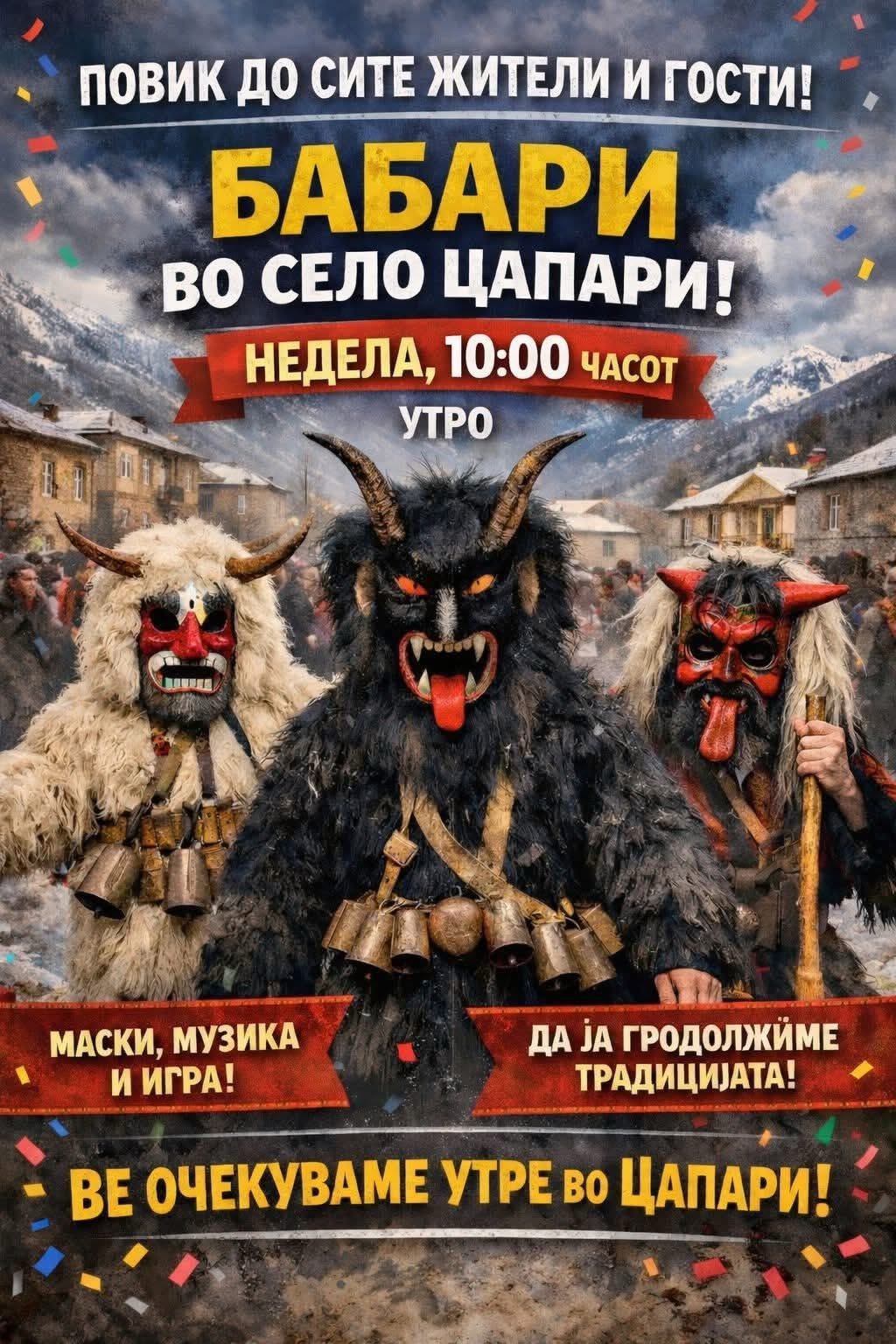 Утре во битолското село Цапари ќе се одржи традиционалниот карневал со почеток во 10 часот. Организаторите најавуваат дека на настанот ќе дефилираат повеќе од 50 учесници, облечени во уникатни и креативни маски.