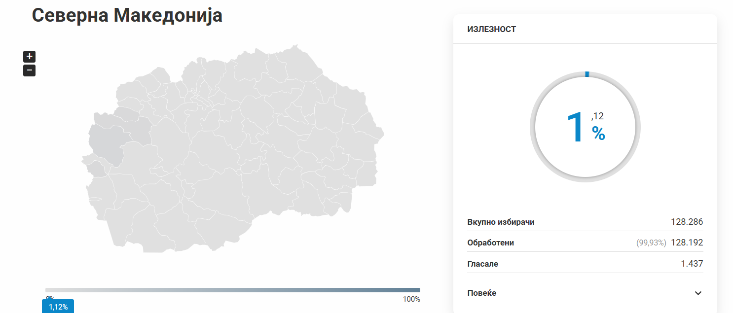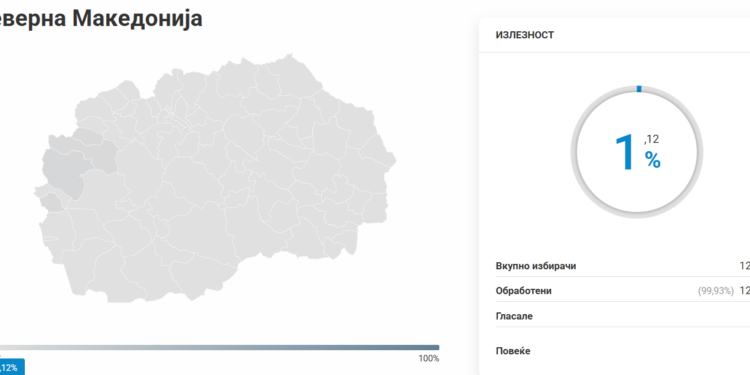 На денешните повторени локални избори во четири општини во Северна Македонија, излезеноста до 09:00 часот изнесува само 1,12%, соопштија од Државната изборна комисија (ДИК). Изборниот процес започна со неколку задоцнувања на одредени избирачки места, што делумно влијаеше на раниот одзив на гласачите.