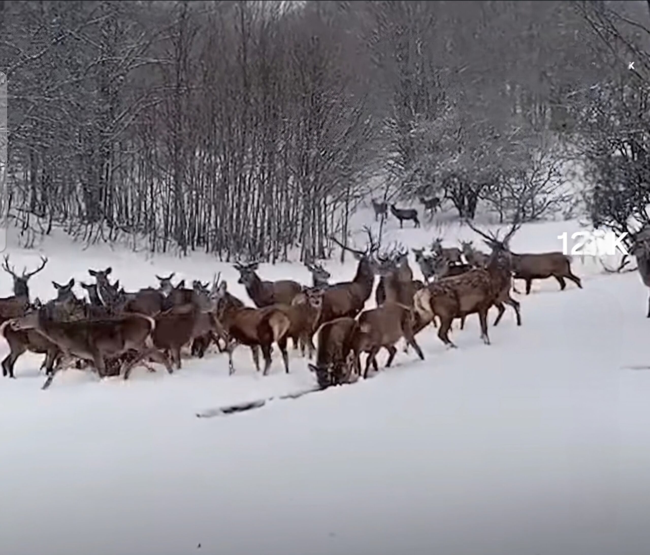 Во Националниот парк Галичица, во снежниот предел на планината, е забележано стадо европски елени, што создава ретка и импресивна зимска глетка, објавија локални медиуми.