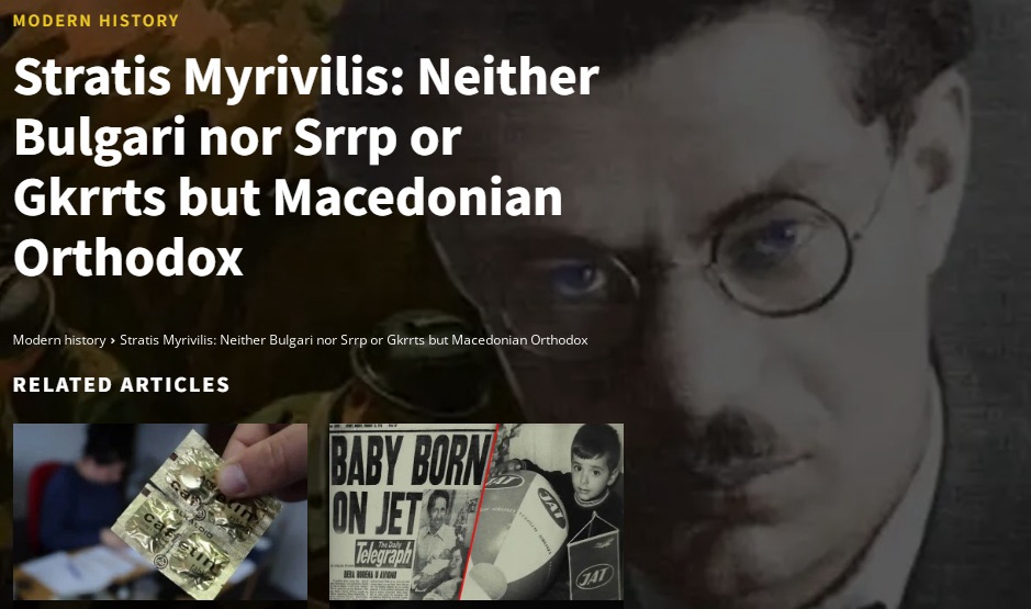 Кога грчката војска ја нападнала Македонија, Миривилис стапил во контакт и со Македонци. Тој пишува дека тие иако од негова гледна точка зборуваат речиси ист јазик како Србите и Бугарите, тие се сметаат себе си само за „православни Македонци“… ниту „Бугари“, ни „Сррп“ или „Гкрртс“… Така пишува Миривилис во својот роман.
