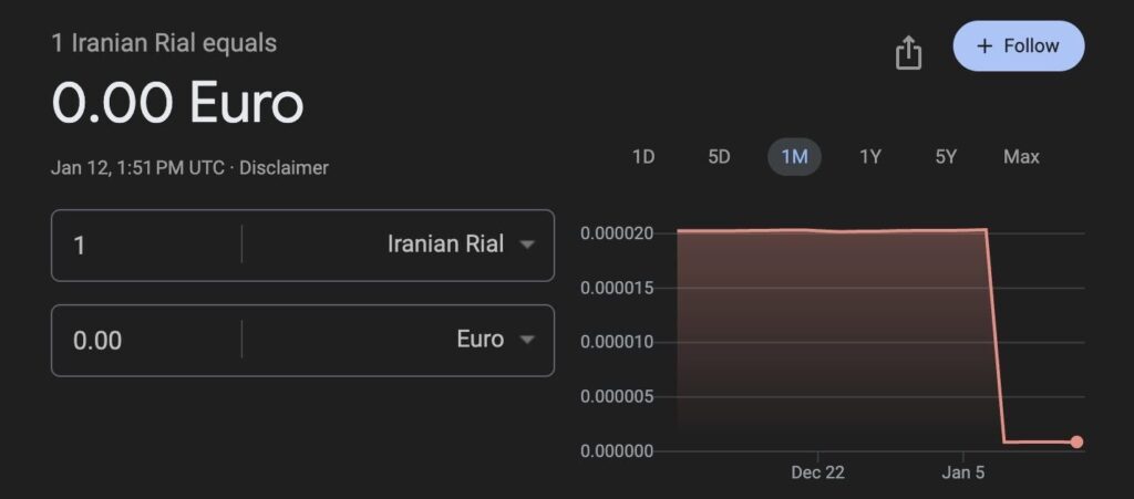 Иранскиот риал повторно се тргува по курс од 0,00 евра, што значи дека нема апсолутно никаква вредност на меѓународниот пазар.
