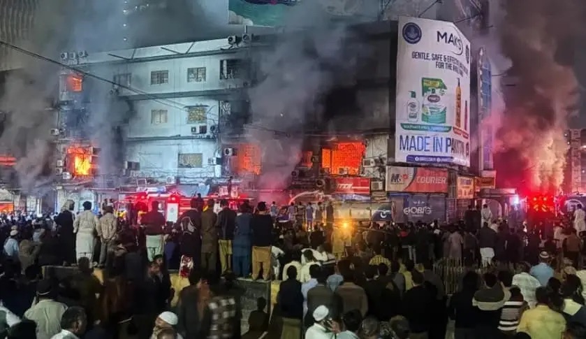 Пожарот избувна во саботата навечер, а причината за настанот сè уште не е утврдена. Видео снимките покажуваат како пламените јазици се шират од зградата додека пожарникарите се бореле цела ноќ да го локализираат огнот во густо населен деловен округ на историскиот центар на Карачи.