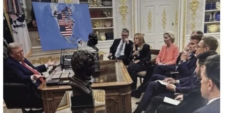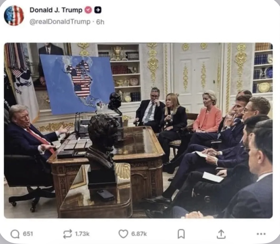 На една од објавите, Трамп е прикажан во Овалната соба со европски лидери, покрај мапа на Западната хемисфера на која САД, Канада, Гренланд и Венецуела се обоени во црвено-бело-сини бои. Фотографијата е обработена верзија на снимка од август, направена за време на средба со европски претставници за војната во Украина, меѓу кои Урсула фон дер Лајен, Кир Стармер и Џорџа Мелони.
