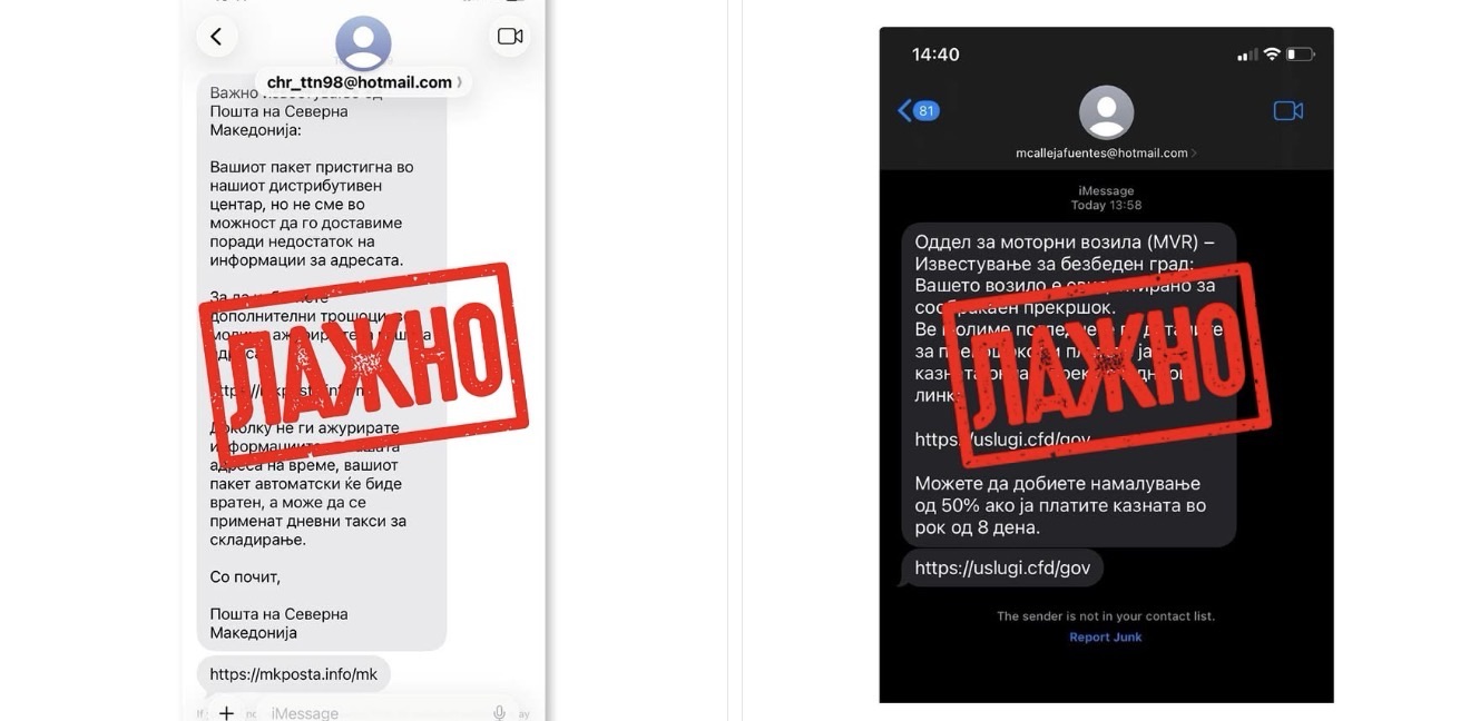 Ве информираме дека дел од нашите клиенти (физички и правни лица) имаат добиено сомнителни SMS, Viber и e-mail пораки со лажни известувања за наводна пратка од Пошта на Северна Македонија и за наводна уплата за сообраќаен прекршок од МВР преку Safe City системот.