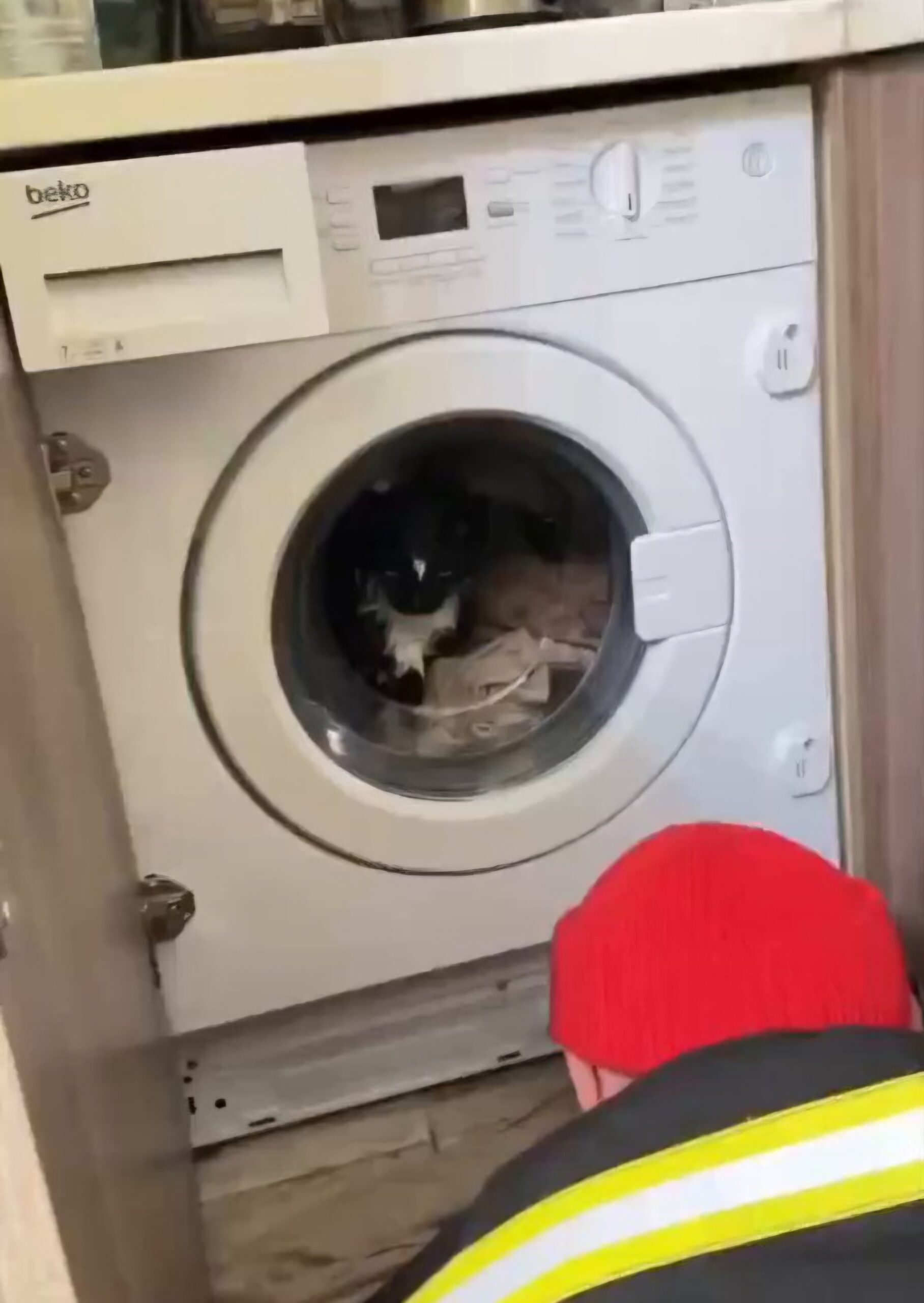 Откако го слушнала мјаукањето, таа веднаш го запрела циклусот, но поради краток спој вратата не можела да се отвори, а водата не можела да се испушти. Во обид да го спаси миленичето, жената повикала спасувачки служби.