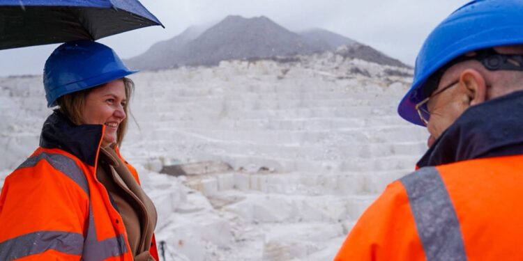Министерката за енергетика, рударство и минерални суровини, Сања Божиновска, денеска беше во теренска посета на „Мермерен Комбинат Прилеп“, каде ги разгледа процесите на експлоатација, условите за работа и инвестициите во модерна технологија и безбедност.