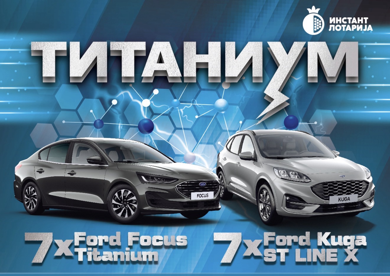 Кога среќата се бара и чудата се можни – доказ за ова е инстант лозот „Титаниум“ на Државна лотарија. Со симболичен влог од само 100 денари, секој играч има единствена можност да стане добитник на еден од седумте Ford Focus Titanium, на еден од седумте Ford Kuga ST Line X или на различни парични добивки.