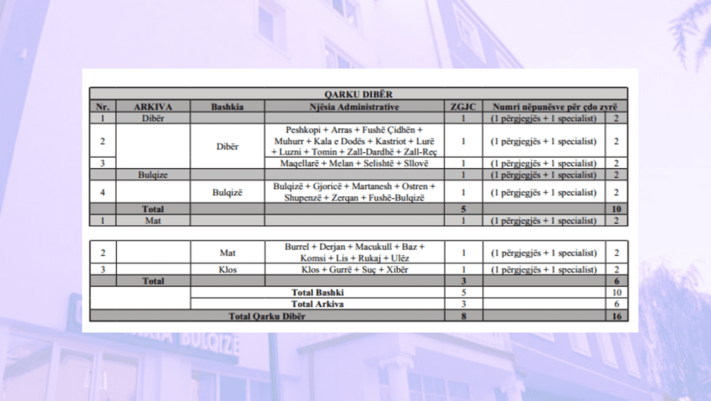 За регионот Дебер се предвидени вкупно 8 канцеларии за матична служба и 16 вработени, вклучувајќи ги и архивските канцеларии во близина на префектурата. Одлуката, исто така, предвидува дека актите и документите на канцелариите што се затвораат ќе бидат префрлени и складирани според законодавството за архиви, додека работните односи на вработените погодени од реструктуирањето ќе се третираат во согласност со Законот за работни односи.