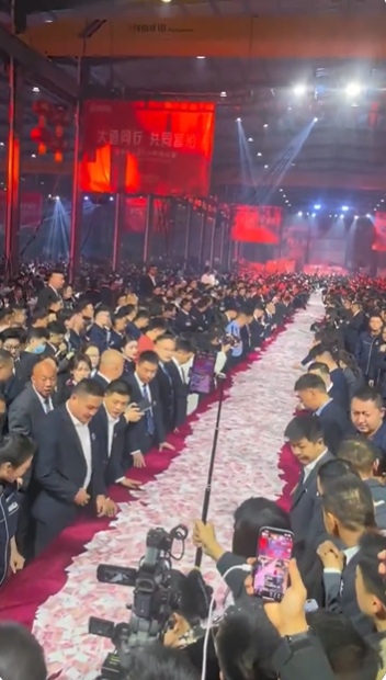 Големата прослава се случи на 13 февруари, во сала преполна со вработени, околу 7.000 луѓе, за кои беа подготвени 800 маси натрупани со купишта банкноти. Во видеа што брзо кружат по интернет, се гледаат сцени што потсетуваат на телевизиски спектакли: маси натрупани со пари до работ, а работници кои со смеа и возбуда ги собираат банкнотите и ги носат во рацете или во пакети.