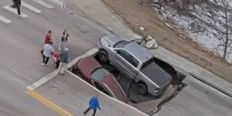 На видеото се гледа како асфалтот под автомобилите одеднаш попушта и возилата паѓаат во дупката, по што на местото на настанот веднаш притрчуваат минувачи за да им помогнат на возачите.