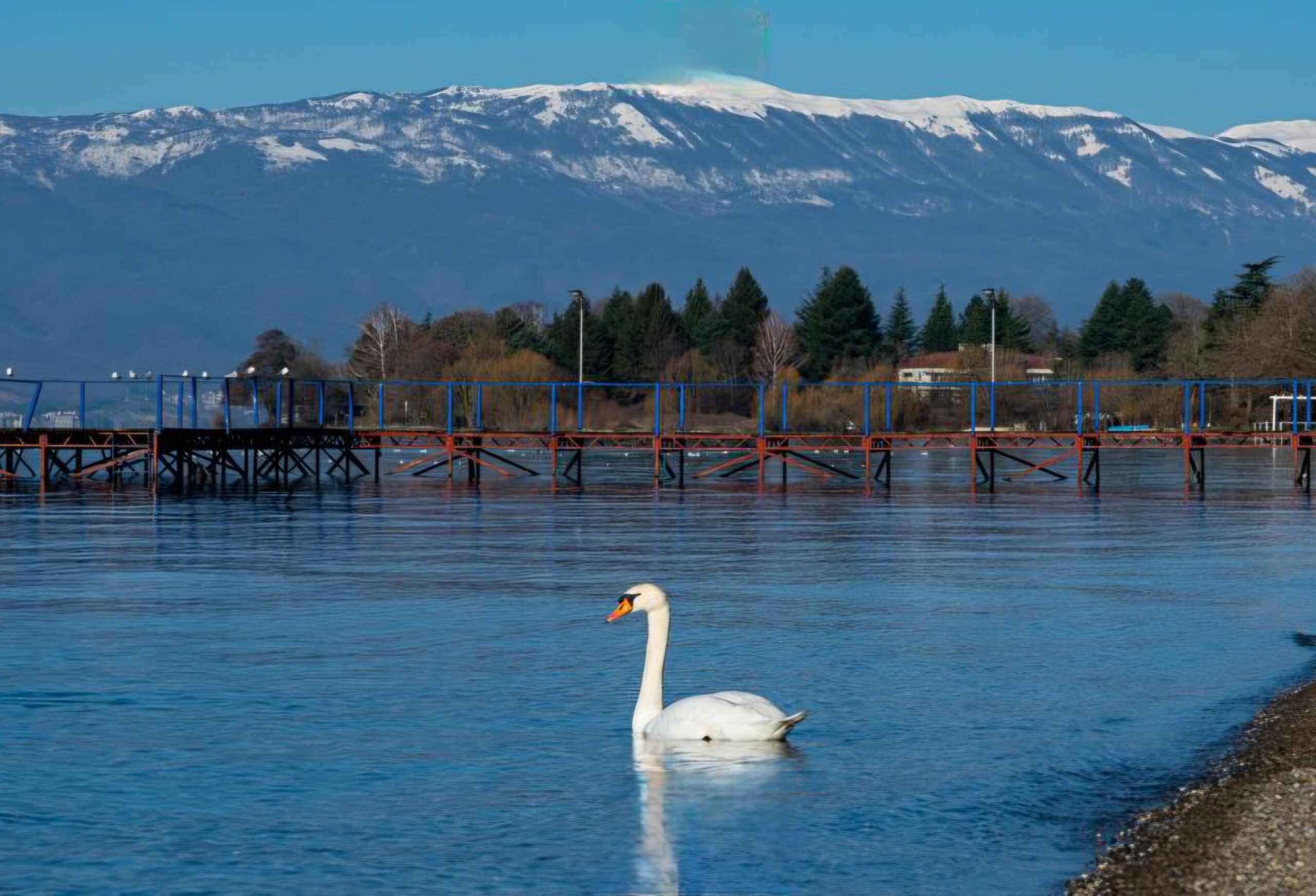 Охрид и во февруари знае да изгледа како разгледница. На Градската плажа „Воска“ денеска беше забележан прекрасен лебед кој мирно пловеше во кристално чистата вода, создавајќи вистинска зимска идилична сцена.