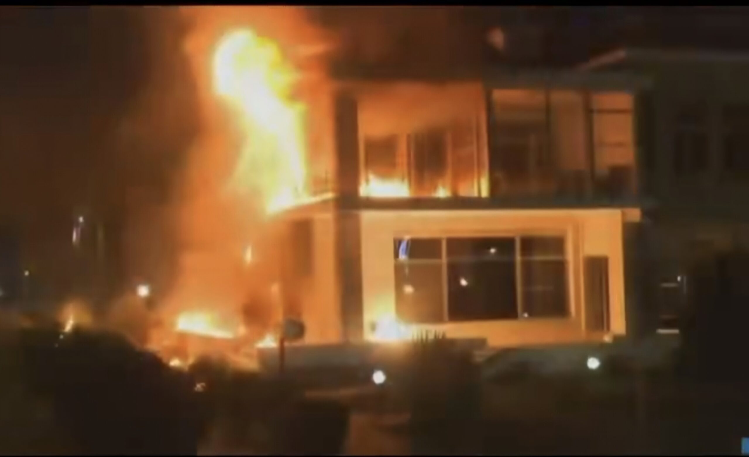 Видеа од настанот, кои се шират на интернет, прикажуваат пламен и густ чад над вилата, додека демонстрантите извикуваат пароли.