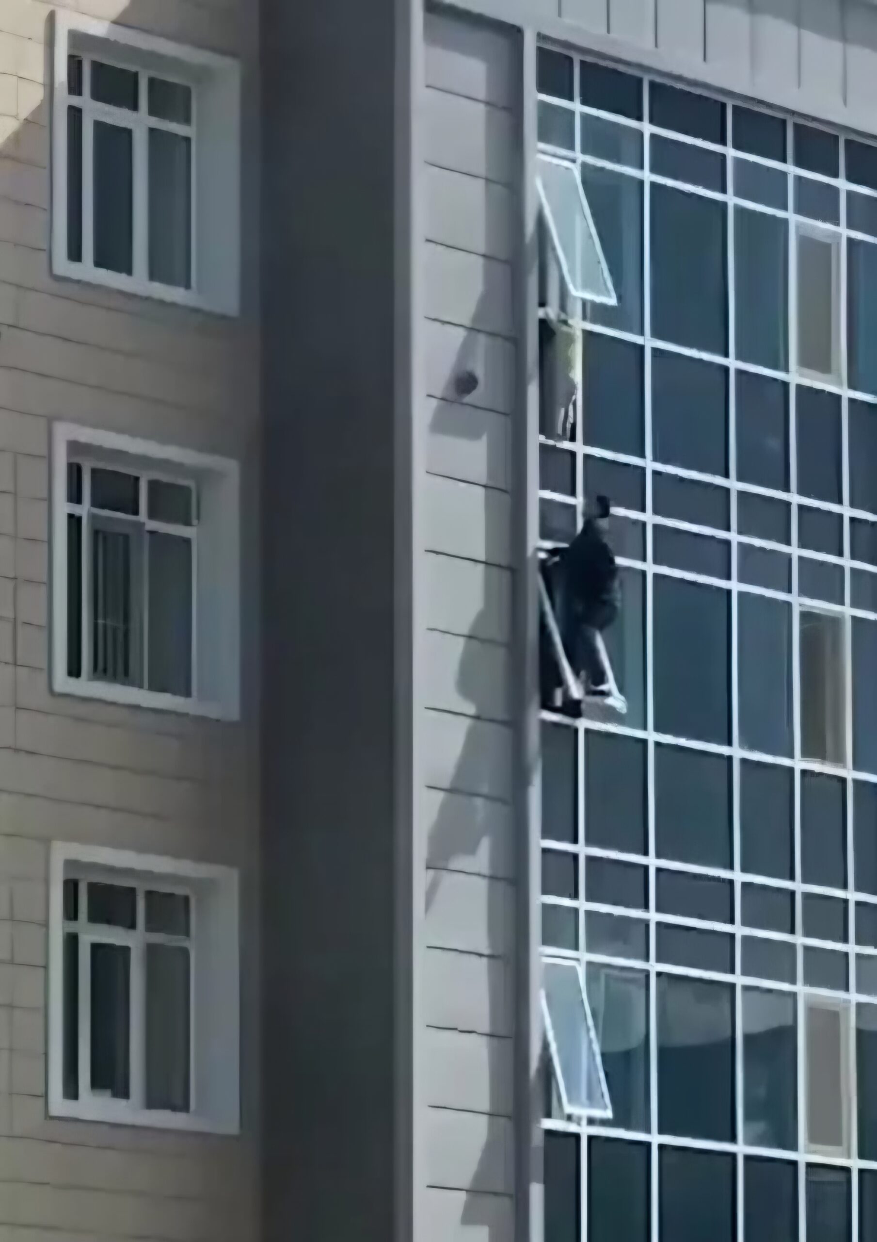Снимката која се прошири на интернет покажуваат како човекот внимателно се движи по фасадата на зградата, држејќи се за прозорецот, додека луѓето под зградата со вознемиреност ја следат ситуацијата.