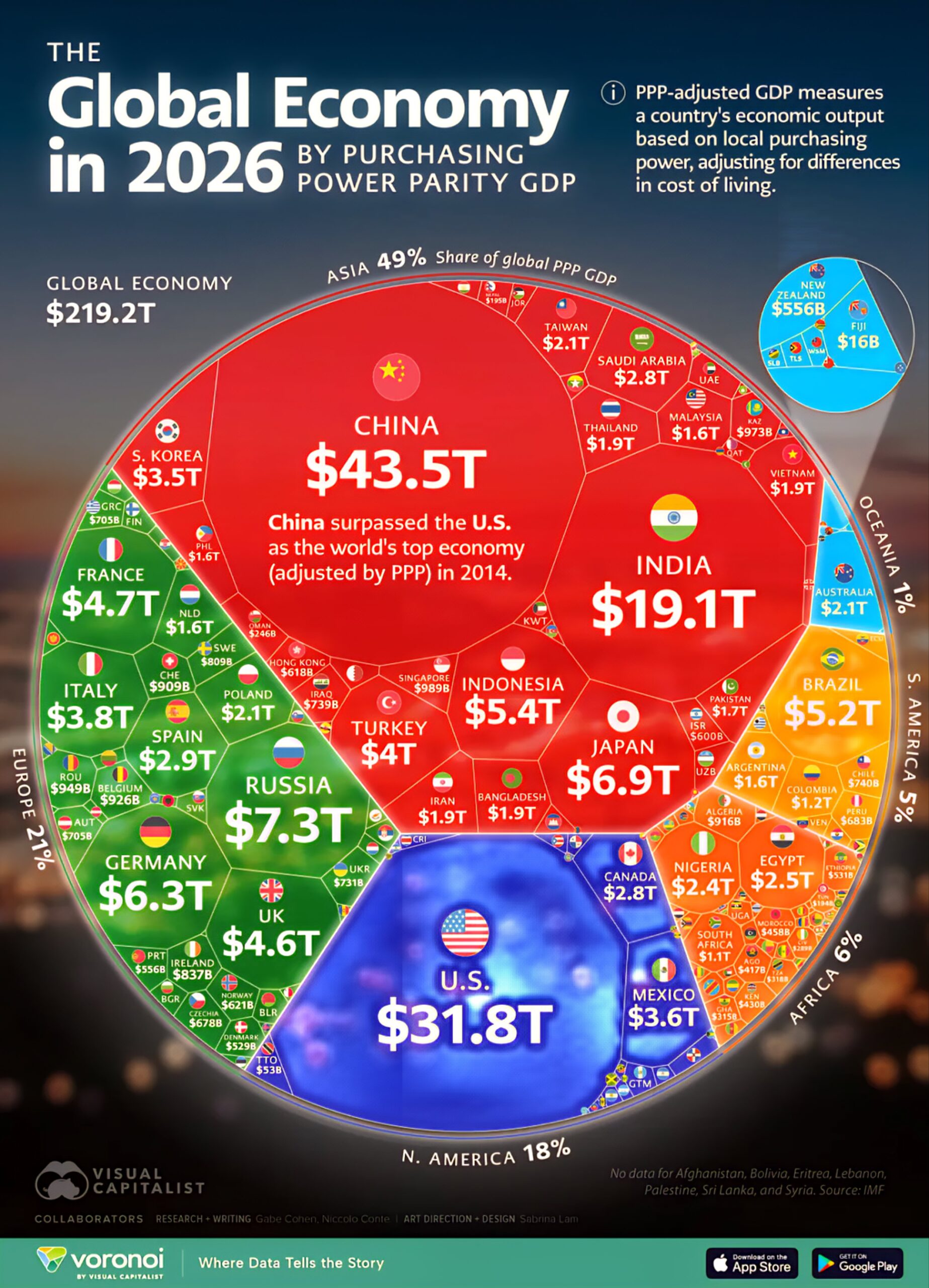 Според податоците на Интернационалниот монетарен фонд, вкупната светска економија во 2026 година достигнува 219,2 трилиони долари, при што најголемиот дел од економската моќ се концентрира во Азија.