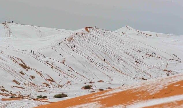 Редок природен феномен беше забележан во Сахара, каде што падна снег и ги покри песочните дини со бела покривка. Поради снежните врнежи, портокаловите дини во Алжир се претворија во необична бела глетка.