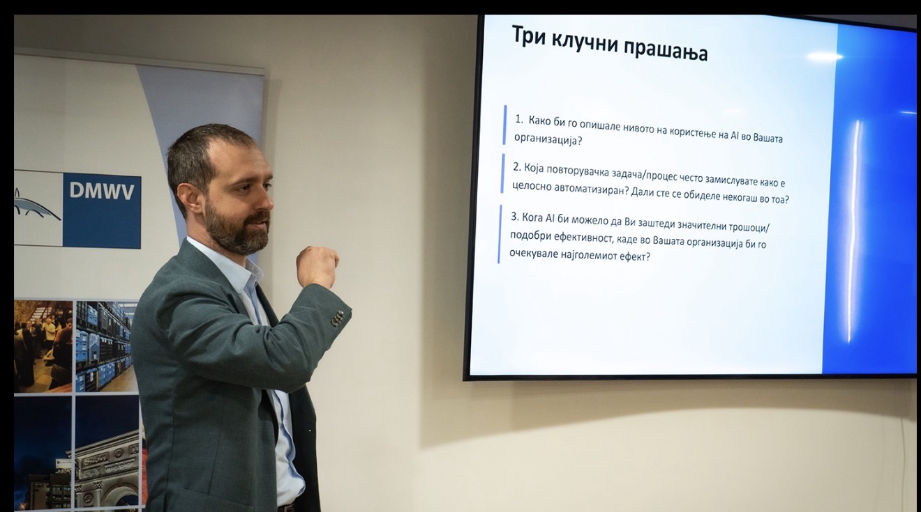 Своите искуства и знаења со учесниците ги споделија Елена Димовска, раководител на секторот за анализа на податоци и АI во Семос Едукација, која се осврна на техничките предуслови и организациската подготвеност за AI имплементација, Кристина Тасева, специјалист за AI имплементација, која презентираше конкретни насоки за проценка и поддршка на компаниите при имплементација на AI, како и Дане Тодоровски, тренер и бизнис консултант, кој ја истакна деловната перспектива и ефектите што компаниите можат да ги постигнат преку правилна и стратешка примена на вештачката интелигенција.
