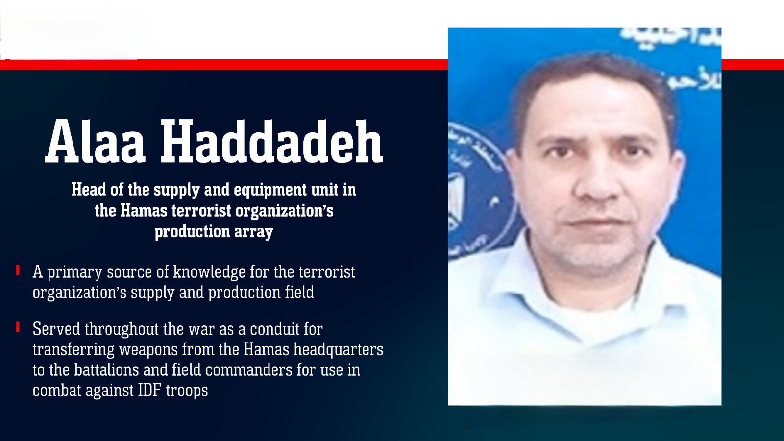 Според информациите, станува збор за Абу Лабда, кој бил одговорен за набавка на оружје и управување со логистичката мрежа на Хамас. Тој имал клучна улога во обезбедувањето вооружување и во организацијата на снабдувачките канали на организацијата.