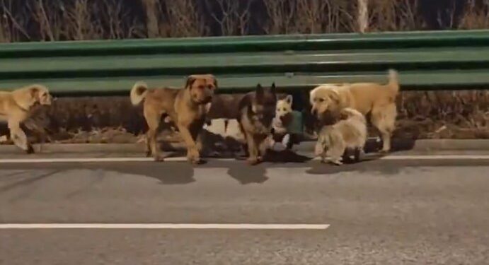 Целата сцена била снимена од случаен минувач по име Лу, кој ги забележал животните како се движат по автопат во близина на кинескиот град Чангчун. Иако се обидел да ги однесе на безбедно, кучињата останале заедно и продолжиле по својот пат. Видеото подоцна било споделено на социјалните мрежи и брзо станало вирално.