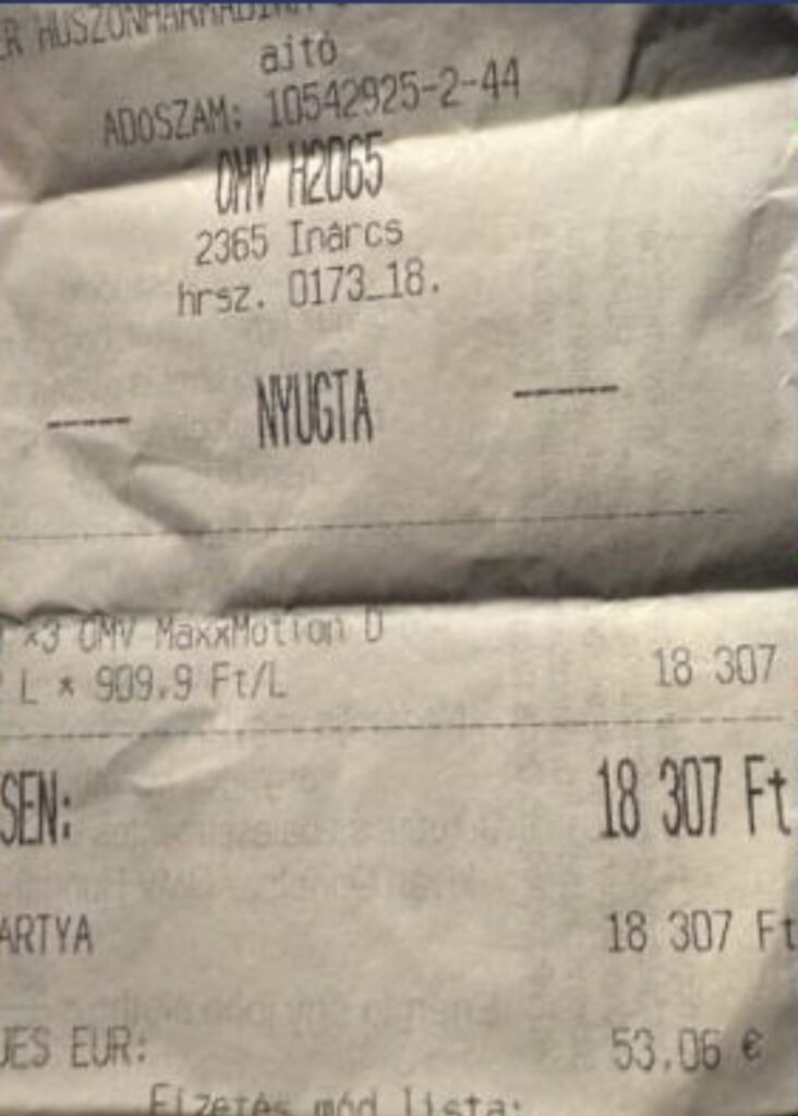 На приложената сметка се гледа дека за точени 20,12 литри дизел по цена од 909,9 форинти, вкупната сума изнесува 18.307 форинти, односно 53,06 евра, што е значително повисок трошок во споредба со цената што ја плаќаат локалните жители.
