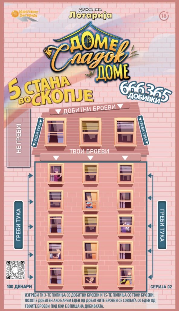 Инстант лозот „Доме сладок доме“ нуди можност за голем број добивки – меѓу кои 5 стана во Скопје, 20 добивки од 100.000 денари, 40 добивки од 50.000 денари и други многубројнипарични добивки. Оваа богата понуда ја прави играта особено атрактивна и достапна за сите што сакаат да ја предизвикаат својата среќа.