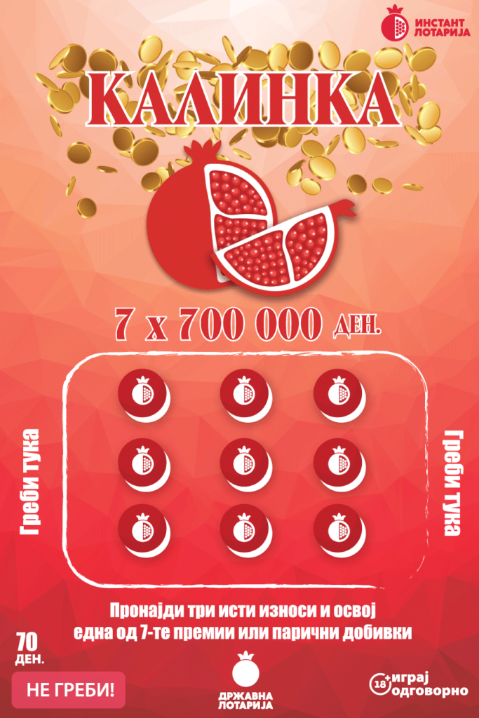 Со својата богата симболика – плодот калинка како симбол на среќа, благодат и радост е дел и од корпоративното лого на Државна лотарија. „Калинка“ е лесна и забавна игра – доволно е да се изгребат полињата за игра и да се пронајдат три исти износи, кои може да ви донесат една од 7-те главни премии по 700.000 денари или една од многубројните други парични добивки.