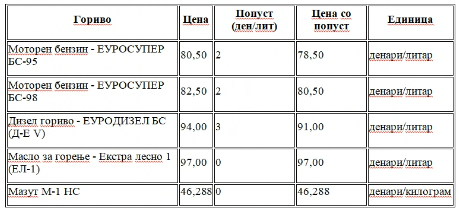 Ова се цените без попустот на ОКТА од три денари за дизелот и два за бензинот, со што горивата ќе бидат поевтини за овој износ.