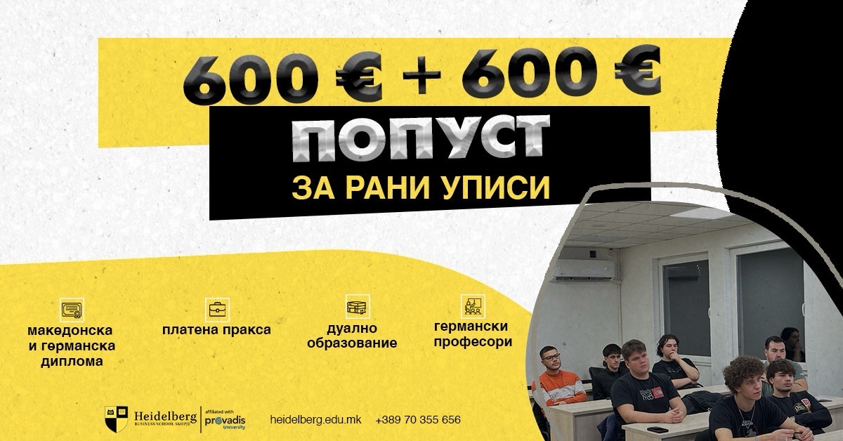 [Скопје, 27.04.2026] – Хајделберг бизнис школа – Факултет Скопје официјално ги отвори раните уписи за новата академска година, нудејќи значајни финансиски поволности и уникатен образовен модел кој директно ги поврзува студентите со пазарот на труд.