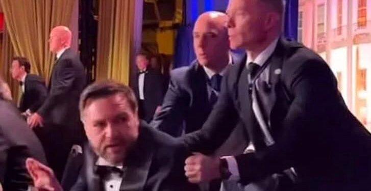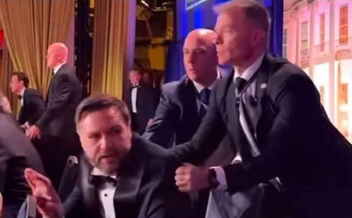 President Trump and Vice President JD Vance were rushed off the stage after shots were fired at the White House Correspondents’ Dinner.#news pic.twitter.com/YQuG8gzTMf