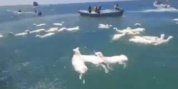 Свет (ВИДЕО) БРОД СО ДОБИТОК СЕ ПРЕВРТИ ВО ЦРВЕНОТО МОРЕ: Стотици овци пливаа за спас, јеменските рибари ги спасуваа од брановите 20.02.2026