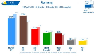 Најновата анкета на INSA спроведена за „Билд“ (BILD), со 2002 испитаници во периодот од 28 ноември до 1 декември 2025 година, открива длабоки и драматични промени...