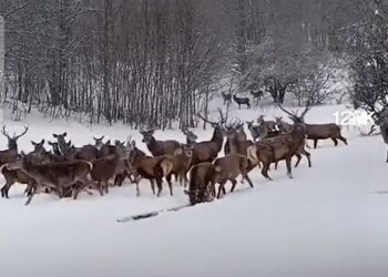 Во Националниот парк Галичица, во снежниот предел на планината, е забележано стадо европски елени, што создава ретка и импресивна зимска...